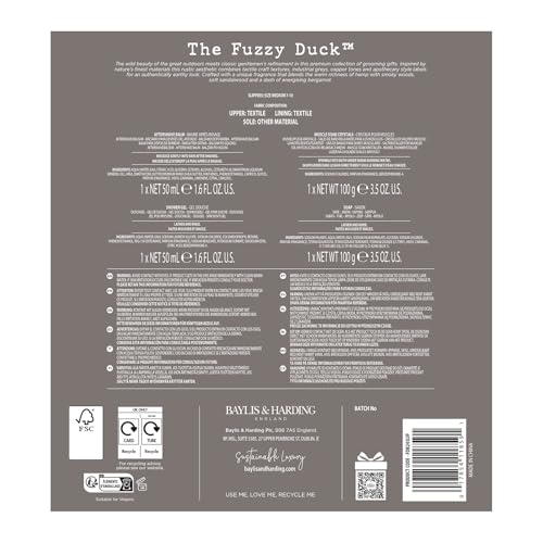 Baylis & Harding The Fuzzy Duck Bergamot, Hemp & Sandalwood Men’s Luxury Slipper Gift Set – Vegan Friendly is a premium collection designed for the contemporary man. This thoughtfully curated gift set includes a pair of cosy slippers complemented by a range of grooming essentials infused with the invigorating scents of bergamot, hemp, and sandalwood. The products in this set are vegan-friendly, ensuring an ethical and responsible choice without compromising on luxury. Treat yourself or a loved one to a pampered experience with Baylis & Harding’s sophisticated selection.