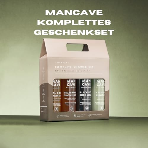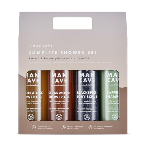 ManCave Men’s Complete Shower Gift Set, 4 Signature Shower Products For Men, Caffeine Shampoo, 2 Natural Sulphate Free Shower Gels and Blackspice Body Scrub, Amazon Exclusive, Vegan, Made in England