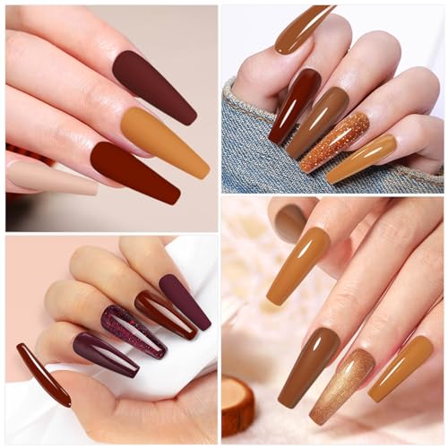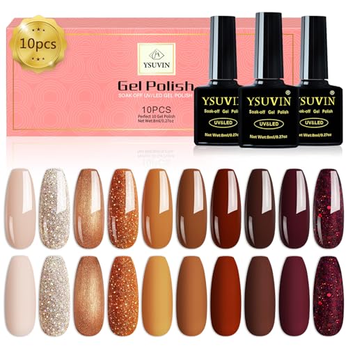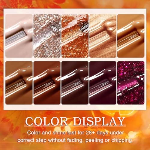 Yueshop Brown Gel Nail Polish,10 Colors Autumn Pumpkin Orange Champagne Burgundy Red Glitter Gel Nail Polish Set Soak off UV LED Lamp Nail Polish (8ml)