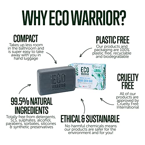 Eco Warrior Charcoal Clear Skin Soap Bar – Vegan, Cruelty Free, No SLS or Parabens, Whole Body Soap, Moisturising Charcoal, Grapeseed and Anti Bacterial Tea Tree Essential Oil, Eco Friendly Soap 100g