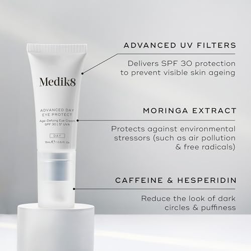 Medik8 Advanced Day Eye Protect – Age-Defying Eye Cream – SPF 30 – Targets Dark Circles, Prevents & Smooths Wrinkles – 15ml is a premium skincare product designed to protect and rejuvenate the delicate eye area. This ultimate anti-ageing eye cream not only targets dark circles but also prevents and smooths out wrinkles. Infused with SPF 30, it provides a robust shield against harmful UV rays.
