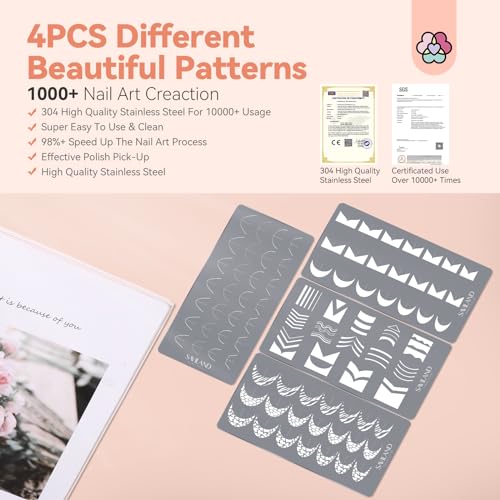 Discover the SAVILAND Nail Stamping Plate Set, a versatile nail art tool kit featuring four distinct plates for creative and intricate designs on your nails. With easy-to-use stencils, this set allows you to achieve professional-looking French tips, elegant wave stripes, and geometric patterns effortlessly. Each plate is crafted from durable stainless steel, ensuring they are reusable for numerous manicures, making them a perfect addition to your DIY nail art collection.