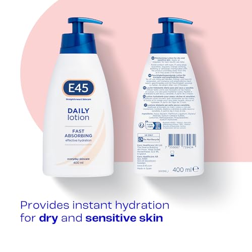 E45 Daily Skin Lotion 400 ml – E45 Lotion for Very Dry Skin – Non-Greasy Lightweight Moisturiser – Perfume-Free Body Face Hand Cream – Dermatologically Tested is the ultimate solution for those seeking relief from very dry skin. This lightweight, non-greasy formula absorbs quickly, ensuring your skin stays hydrated without any sticky residue. As it is perfume-free, it is gentle on sensitive skin, making it a perfect choice for daily use on your body, face, and hands.