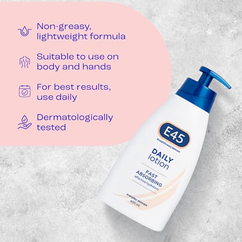 E45 Daily Skin Lotion 400 ml – E45 Lotion for Very Dry Skin – Non-Greasy Lightweight Moisturiser – Perfume-Free Body Face Hand Cream – Dermatologically Tested