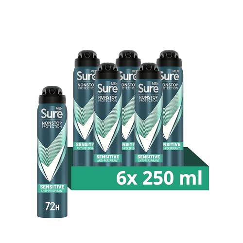 Sure Men Nonstop Protection Sensitive Antiperspirant Deodorant Aerosol pack of 6 deodorant for men for 72-hour sweat and odour protection 250 ml