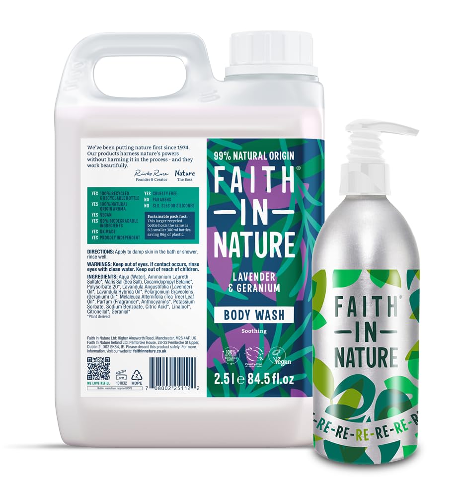 Faith In Nature 2.5L Lavender & Geranium Body Wash & Aluminium Refill Bottle Gift Set, Vegan & Cruelty Free, No SLS or Parabens